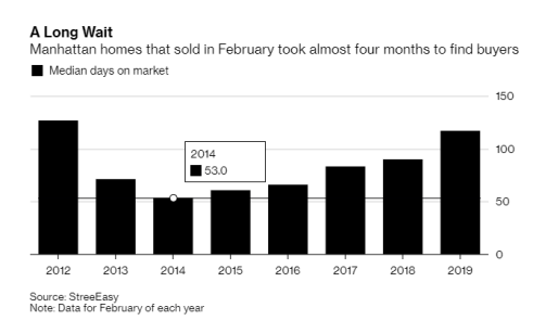This chart shows the average length of time each property sat on the market. You have to go back seven years to see when properties lasted on the market this long. Bloomberg complied an exceptional piece about New York city’s falling home prices.
