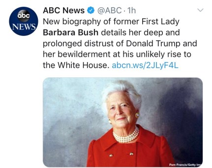Barbara Bush will have a posthumous autobiography published. The most clickable story so far was her comments on Trump. It’s not surprising that she did not like him. What is surprising is the claim that she considered herself no longer a Republican. She supposedly kept a countdown clock near her bed as to when his term would be up.