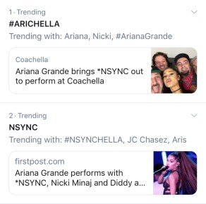 Ariana Grande surprised her fans while closing out Coachella by bringing up *NSYNC on stage. Well, not all of them. Justin Timberlake was not part of the impromptu reunion. It didn’t stop fans from celebrating the move.