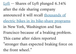 Lyft continued to fall on the third week of their disastrous IPO. First, the optics and fallout from their lawsuit against their underwriter has continued to appear embarrassing and painted the company in a negative light. Second, the company runs bike-share programs in NYC and had to pull its fleet of electric bikes when the front brakes experienced issues. The stock continues to fall.