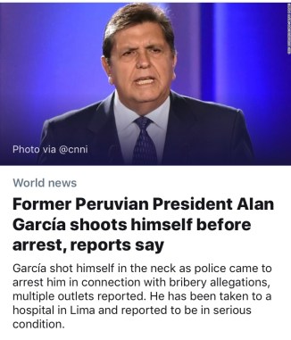 A guilty leader from Peru appeared to have taken his own life instead of going to jail for crimes he committed. The former leader killed himself rather than turn himself in.