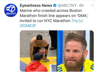 This year’s touching story from the Boston Marathon was quite incredible. A Marine who lost two of his comrades ran the race in their honor. He experienced excruciating cramps at the very end and was unable to walk. However, that didn’t stop him. The man crawled past the finish line to complete the race. What an amazing moment.