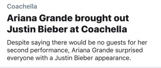 Grande didn’t bring back *NSYNC (without Justin Timberlake) during her week two set at Coachella. Instead, she brought (newly retired) Bieber on stage to close out the festival in the desert.