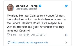 Trump couldn’t get enough Republican support for Herman Cain, and subsequently had to pull his nomination for his Federal Reserve Governor appointee. I guess free Godfather’s pizza wasn’t a good enough bribe.