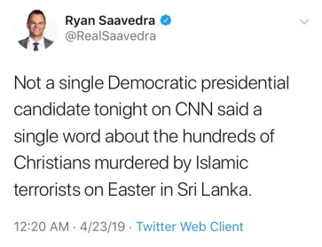 There is an obvious denial from Democrats that Christians, and Catholics in particular, were targeted and massacred by Islamist terrorists. It important to understand what happened on CNN on the Monday following the Easter Sunday attacks. CNN hosted five Democrat candidates. Senator Amy Klobuchar (MN), Senator Elizabeth Warren (MA), Senator Bernie Sanders (VT), Senator Kamala Harris (CA), and Mayor Pete Buttigieg of South Bend, Indiana.