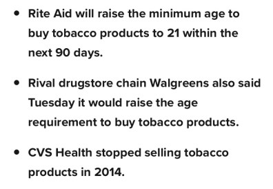 It has been a tough year for CVS, Walgreens, and Rite Aid, and things have continued to get worse. Why? Well, they are battling two fronts. Front number one is prescription drug costs. Democrats have their eyes set on reducing the cost, and it is likely something Trump and Republicans will agree on. Front number two is the FDA and e-Cigarettes. The FDA has clamped down on usage among minors, and we saw this headline in response to the pressure.