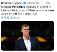 Kristaps was involved in a bad fight it Latvia over the weekend. The video was bad as he walked out of the club, bloodied face, and proceeded to shove a woman out of his way. Allegedly, he was jumped by Russians who were angry he left NY. ALWAYS the RUSSIANS.