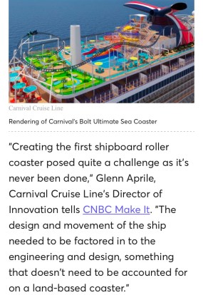 Take a look at the renderings from Carnival. They intend to put a roller coaster on a cruise ship. The first of its kind.