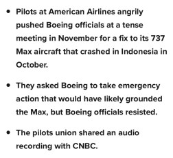 The news worsens for the company. Check out what happened between the Pilots Union and Boeing between the first and second crash. This quote from the meeting courtesy of American Airlines pilot Michael Michaelis is quite damning.